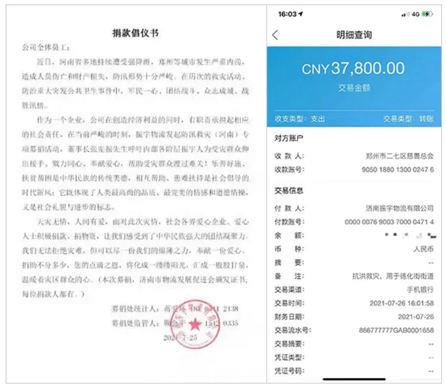 在當(dāng)前嚴(yán)峻的時(shí)刻,振宇物流發(fā)起防汛救災(zāi)(河南)專項(xiàng)募捐活動,董事長張憲振先生呼吁振宇人為受災(zāi)群眾伸出援手、戮力同心、奉獻(xiàn)愛心,幫助受災(zāi)群眾渡過難關(guān)!大家慷慨解囊、踴躍捐款,7月25日、26日兩天時(shí)間匯集捐款37800元。
