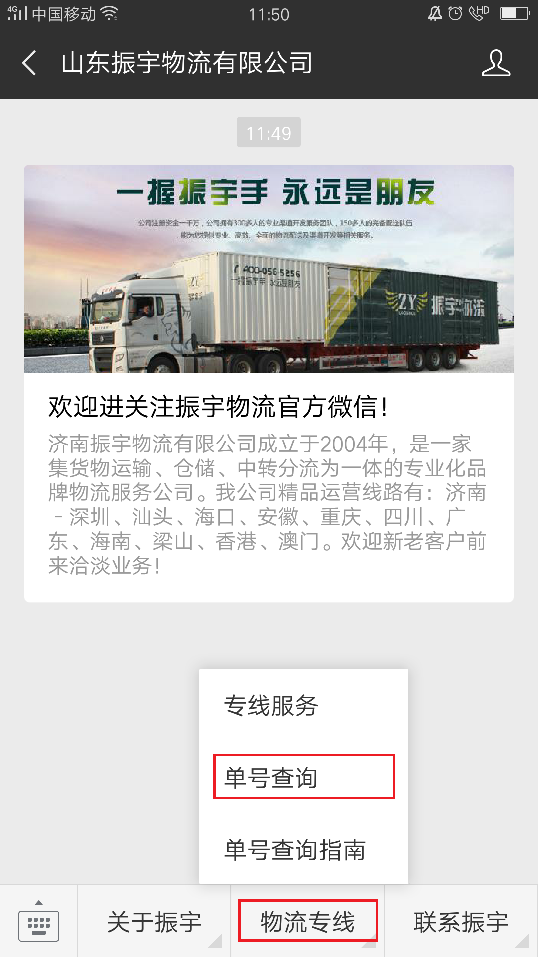 2.關注山東振宇物流有限公司公眾號。