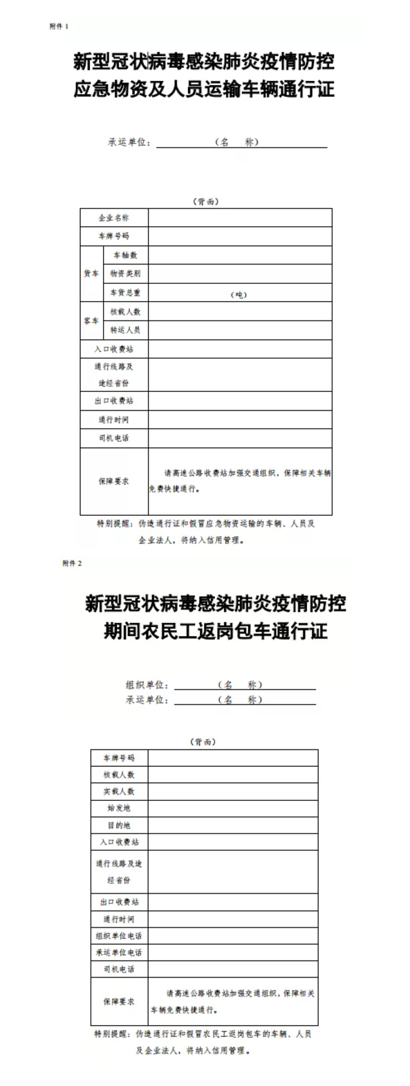 通知要求,地方各級交通運輸部門要認真落實《交通運輸部關于切實保障疫情防控應急物資運輸車輛順暢通行的緊急通知》和《交通運輸部關于疫情防控期間免收農民工返崗包車公路通行費的通知》要求,切實簡化“新型冠狀病毒感染肺炎疫情防控應急物資及人員運輸車輛通行證”(簡稱“車輛通行證”)、“新型冠狀病毒感染肺炎疫情防控期間農民工返崗包車通行證”(簡稱“包車通行證”)辦理流程,通過政府網站、微信、電子郵件等便捷方式提供“車輛通行證”“包車通行證”統一式樣,供承運單位或駕駛人在本地自行打印、自行填寫。