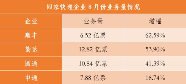 9月18日晚間,順豐控股、圓通速遞、韻達股份和申通快遞四家企業發布8月經營簡報。數據顯示,四家快遞企業繼續保持高速增長。其中,順豐業務量增幅繼續領跑,韻達連續五個月、圓通連續四個月單月業務量破10億票。