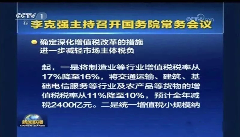 會議指出,過去五年通過實施營改增累計減稅2.1萬億元。按照黨中央、國務院部署,為進一步完善稅制,支持制造業、小微企業等實體經濟發展,持續為市場主體減負,會議決定,從2018年5月1日起,一是將制造業等行業增值稅稅率從17%降至16%,將交通運輸、建筑、基礎電信服務等行業及農產品等貨物的增值稅稅率從11%降至10%,預計全年可減稅2400億元。